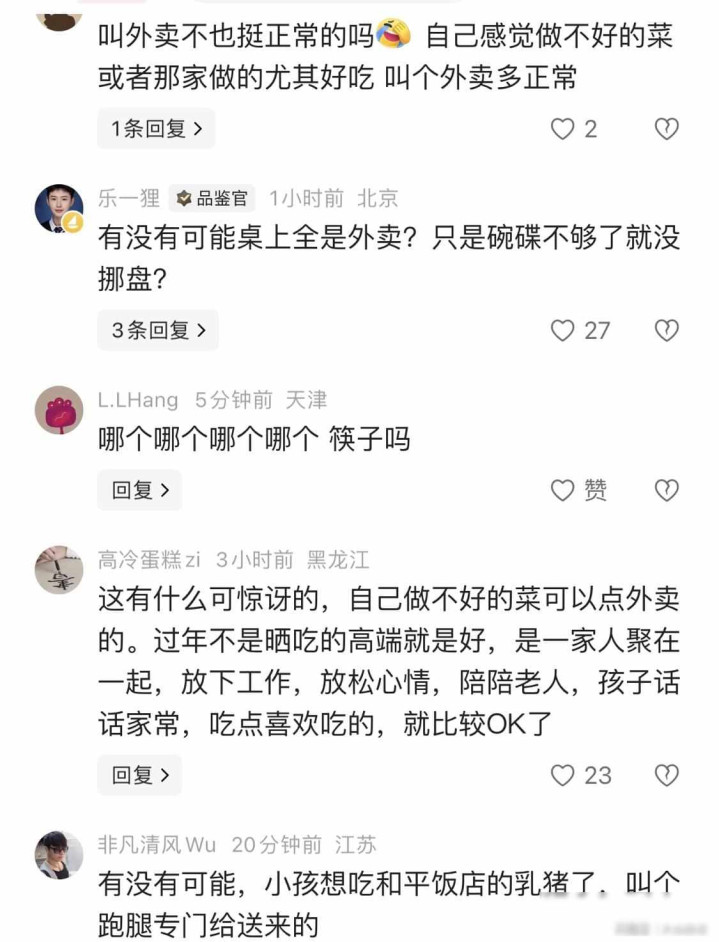 有人立刻提出疑问,觉得明星过年还点外卖显得有点随意,其他人回应说团聚才是关键,没人规定年夜饭必须亲手做,还有人猜测可能整桌菜都是预订的,只是盘子不够用,临时拿原包装凑合一下,其实现在很多城市家庭都这样,特别是北京上海这些地方,除夕夜叫个预制菜再加几份热菜,已经挺常见了。